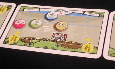 Promotional game for Gerolsteiner mineral water. The game consists of a deck of cards, some carboard counters and a special 6-sided die with only numbers 2,3 and 4 (repeated, of course). Most of the cards are road segments, some of them with a Gerolsteiner area where you can gather up Gerolsteiner energy counters. The rules of this one are quite simple (just another dice game), which disappointed me considering that "Windschatten" means "protection from the wind", and this made me expect a more tactical game. Anyway, the more games I have, the more I appreciate small ones!PS: Thanks, Geert, for sending me this one.