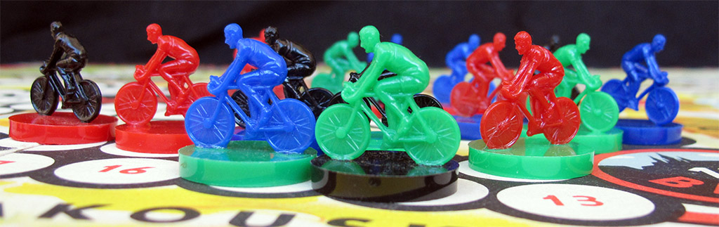 There are four teams of four riders each. What determines the colour of the team is not the rider itself but the colour of the base, which is counterintuitive (IMHO) the first time you play. Each team has four riders in different colours, which are the colours of the marbles. Besides, there is a yellow riders with a yellow base which does not belong to any team but is supposed to replace the leader in every turn of the game.