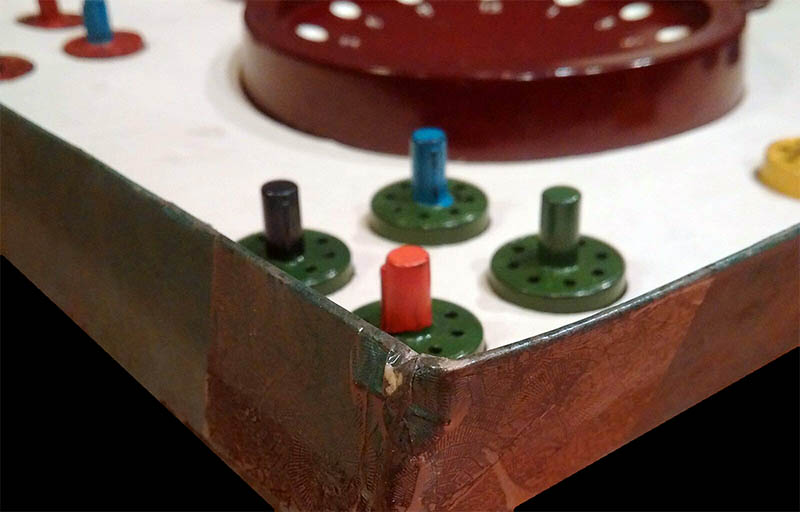 The most amazing feature of the game (and what makes it different) is that it does not have a dice but a spinning top that hits four small coloured marbles which fall randomly into holes numbered 1 to 12. Players need some dexterity to make sure that all the balls fall into a hole, but apart from that the result of the throw is random