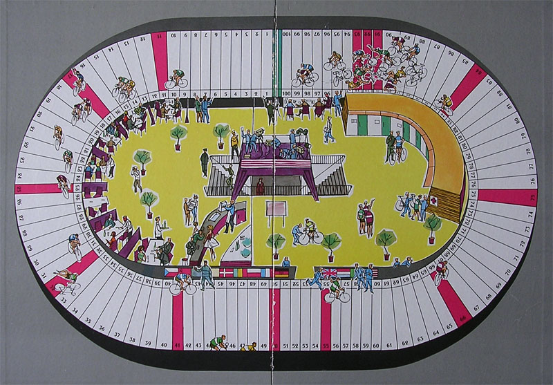 By the way, the only non-trivial game is the team pursuit, in which each player manages a team of two riders. Each team starts on opposite sides of the track. On his turn, a player throws one die and decides which of his riders he advances. The winner is the player whose first rider catches his opponent's second rider. My question is: which is the correct strategy? Send me your answers. (Yes, the correct strategy is to throw more sixes than your opponent, but I do not accept this answer).