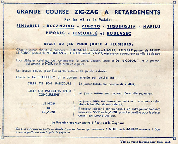 However, in the other rules (see above), the colour of the die throw has no relation whatsoever with the colour of the cyclists. I do not know which were the original rules and which the variation. What I can tell is that these newly found rules are obviously more elegant (with the other rules, one wonders what is the use of having a colour die in the first place). My guess is that these are the original rules, but further research is needed to be sure.