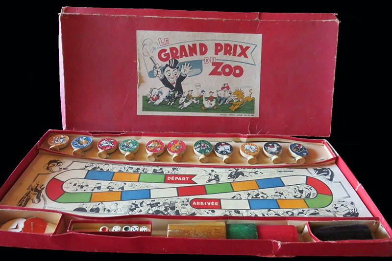 Humoristic game from François Cardinet's collection. Though it looks like a kids game, it is not exactly so, since players bet (though, supposedly, with chips, not with real money) and the board is full of mentions to alcoholic beverages.