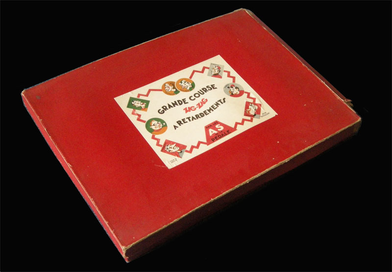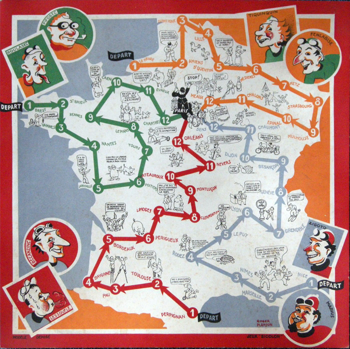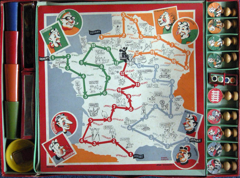 There are several versions of the game. Here is a smaller version from Pierre & Bilou's collection. What's strange is that on this (also smaller) board one of the riders (round red rider on the bottom left) does not have name.