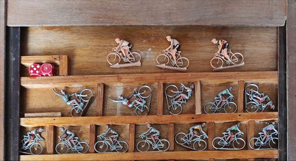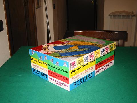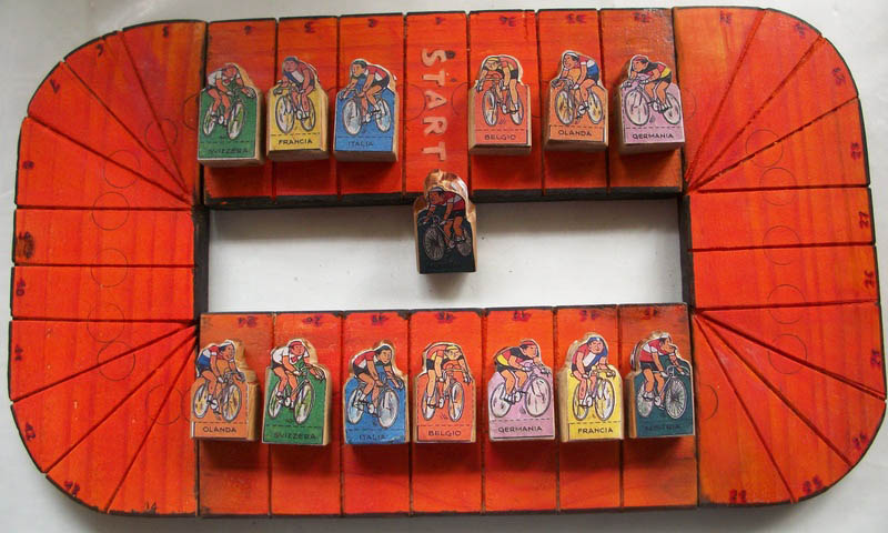 Daniele Banfi has been making cycling games forever. Among others, he has built most of the Corriere Dei Piccoli games in wood, or has gathered the rules of different cycling games in a collection called Compendium di Ciclismo, also made in wood. Here are a few pictures of his extraordinary work.