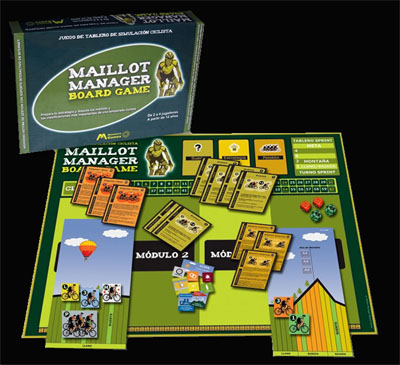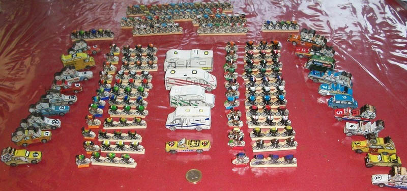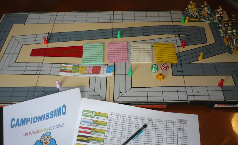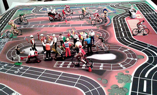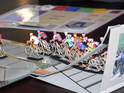 This is a game made by Dominique Paget from France. It is a dice game, complete with rules for almost every cycling topic (climbs, aspiration, energy management, time-keeping for stage races...) Most of the rules are what you might expect from this kind of game, including chance cards and different dice for different types of road ("oh no, another roll-and-move dice game!" I hear some say), but the energy management rule is original and gives the game a strategic touch.
