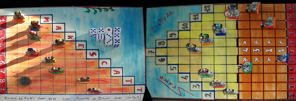 UPDATE 2022: Daniele Banfi keeps making cycling games. His creativity knows no limits. Here are a couple of examples (formally similar, maybe, but different in rules). One of them is inspired by yours truly's Keirin game, as you can see.