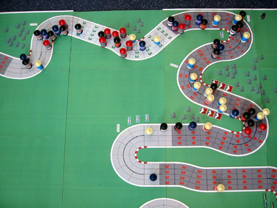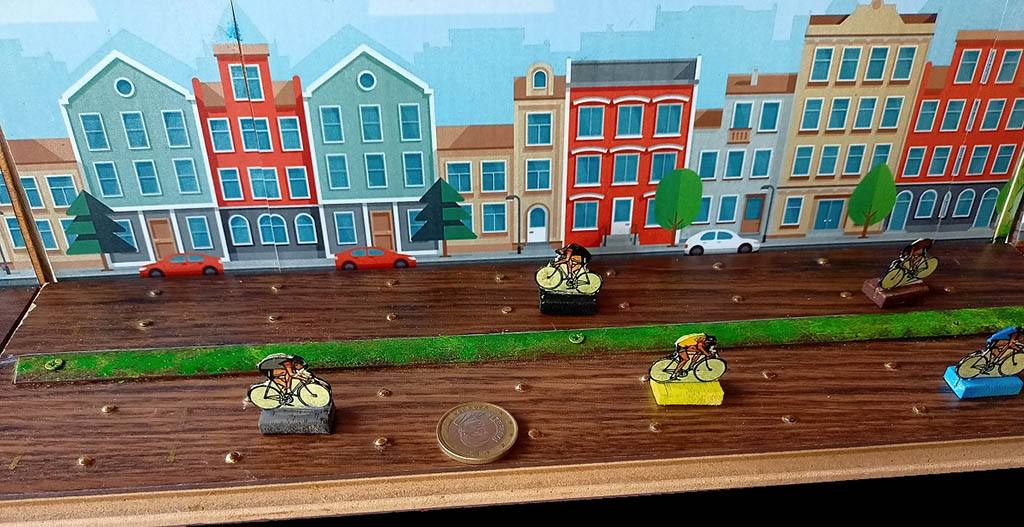 This game has been in my head for some time now and I think it’s worth a playtesting. It is very loosely based on Sprint Cycling. When I was young this always struck me as a daft name because they don’t (sprint, that is) at least not until the final 200 metres or so. The bulk of the contest is taken up by an elaborate battle of wits in an attempt to hang behind the opposing cyclist until the last possible moment.