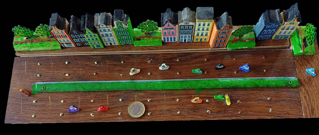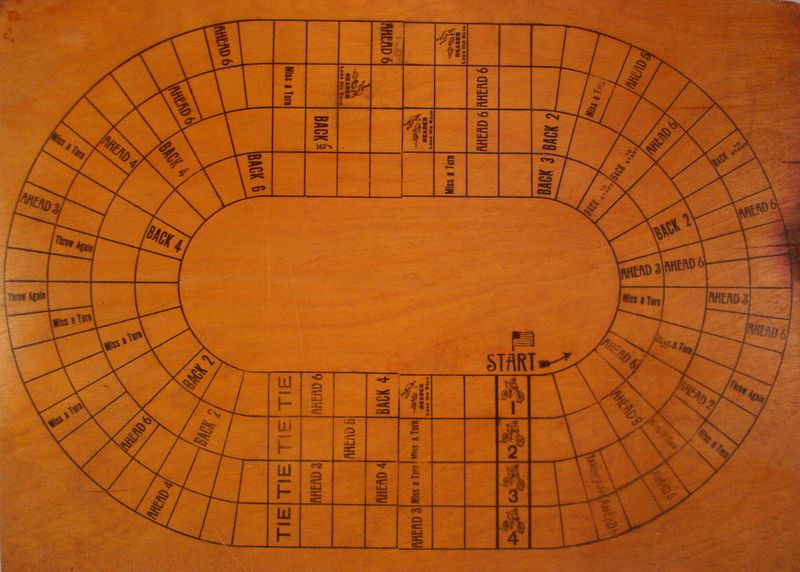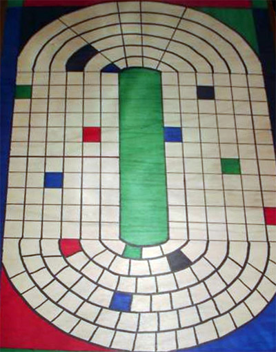 A) Colourful 120 x 80 cm wooden track offered on eBay in 2010 as a multi-purpose board (that means, with no particular rules). It was said to weight almost 5 kg (!). All I can add is that the seller was French.