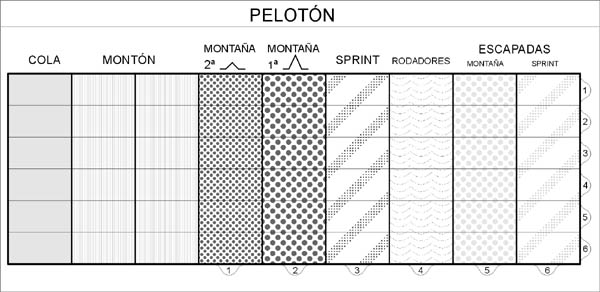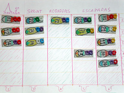 "A RUEDA" (which translates as "on the wheel" or "in the draft") is an ambitious energy management game by Josep Manuel Torres from Barcelona. The rules are very detailed, almost 40 pages long and I would say I detect an influence from the Avalon Hill family of games. Almost every contingence that you can find in a cycling race is covered except doping. There are three levels of play (junior, senior and master), three or four players per team (depending on the level of play) to be chosen between eight categories of riders (from team leader to time trial specialist, including the usual climber, sprinter, rouleur, etc...), which may have four different qualities (aggressive, explosive, descender, recovery). Needless to say, all types of stages and terrains are covered. There are dice in this game, but they are only used to determine the outcome of race incidents (punctures, falls...) and weather conditions. The movement of the riders is determined by how much energy they are willing (or able) to spend in every turn. All this is managed by tables and one of the players acts as game director and is supposed to be too busy to take part in the race. According to Josep-Manuel, the game plays quite fast, and a stage should not take much longer than an hour. One can argue that just reading the rules takes longer than that, but of course players are not supposed to read the complete rules every time they play the game. The secret to the short playing time is the fact that only riders who are not in the peloton behave independently, while the riders in the peloton only do so if they attack or if they are dropped.As I write this (december 2014) the game is still in beginning of the testing phase and Josep-Manuel is open to suggestions. If you feel like contacting him, drop me a line and I will put you in touch with him.