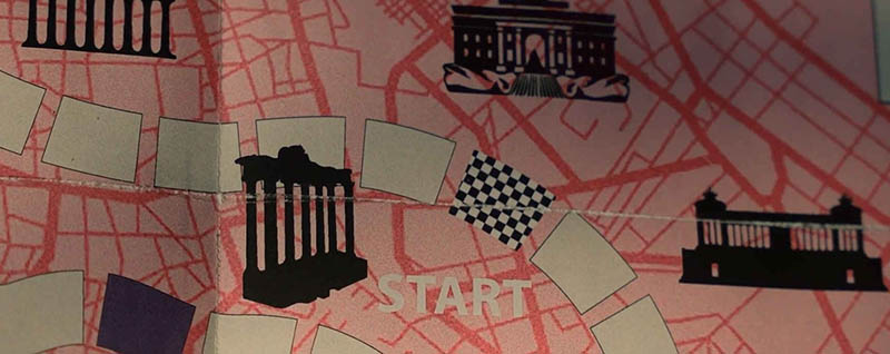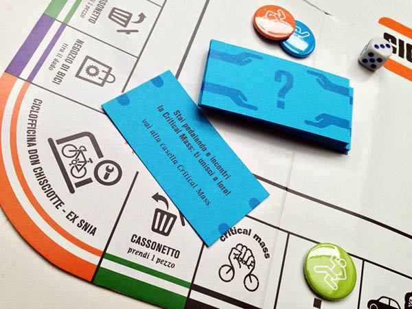 This is a board game designed by Paola Chiarolini upon an idea from Rossella Ottaviani for the Ciclofficine Popolari in Rome. The Ciclofficine, by the way, are bike co-ops where you can repair your own bike and, of course, are ideologically at the other end of the spectrum of what the Monopoly game means.