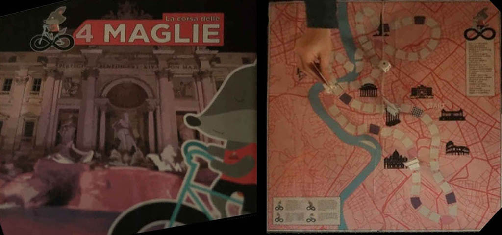 This nice (well...) board game, complete with its box, represents a race in Rome and is seen on the promotional video for the 2023 Giro d'Italia, whose final stage happens to be in Rome (which is far from usual). Quite a lot of details about the game can be seen in the video, including the board, the four "maglie" figurines, one die, young children playing... We cannot read the rules, but we can see they are quite short. With this in mind, we can assume that it is a simple roll-and-move dice game for four players.