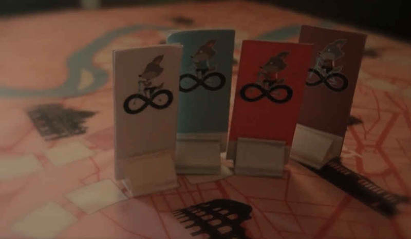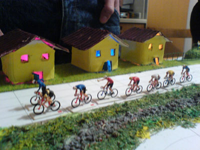 As you can see, the prototype had cardboard riders (well, if you see one made of plastic... it was a substitute since we were more players than cyclists), fences, even a ramp!