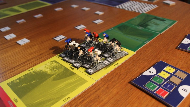 9. If a cyclist’s movement takes him to a space where he would land on the same place as another cyclist then he moves to the next available forward space. It is therefore possible to overtake a continuous group of cyclists by playing a movement crd that would place a cyclist on the same space as a cyclist at the back of the group. This (sort of) simulates a rider moving up to join a group but being forced to move to the front of the group (taking the bulk of the wind resistance) for his audacity.