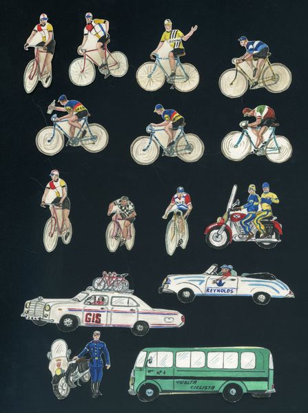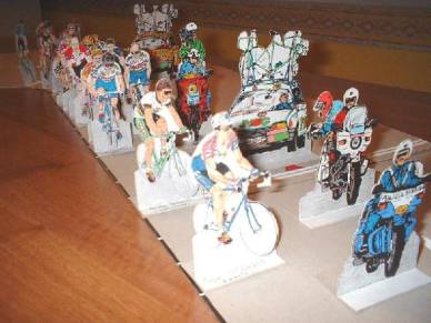 (a) Chaque jour au milieu de l’après midi, je revenais me poster devant la télé [..] Mes heros. Jamais fatigués, toujours prêts, en attendant la transmission, à courir une étape “pour de faux” avec mes petits coureurs de métal que j’alignais dans le couloir carrelé, propulsés par le jeu du hasard et à coups de double-six. (“Mes Tours de magie” in C’est mon Tour, collectif, Eden, 2003, p.36)