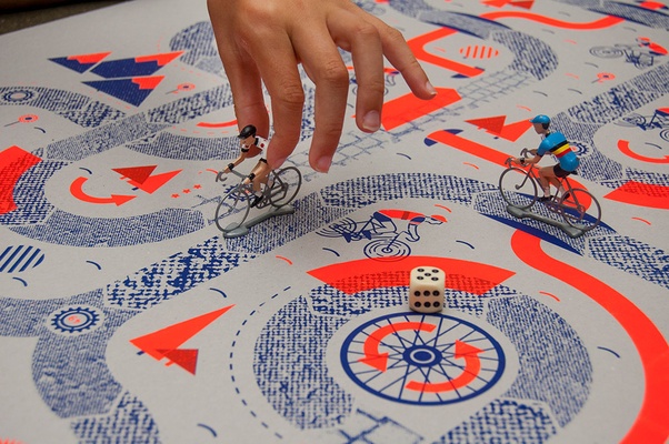 A fine design made by graphic designer and visual artist David Boon, from Antwerpen, for his children and a few lucky friends. David tells me that only ten copies were printed (on what looks as an A0 vinyl). It is a simple roll-and-move game, but you can play different races, since the race incidents (numbers within circles) change between different races (same incidents in different places, actually). There are specific rules for the cobblestones sections, as might be expected from someone from Flanders. You can see a few more pictures here.