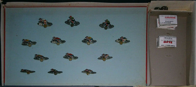 If you look closely at these Montaplex cyclists, you will see words written on some of them. I can read "llano" (flat) and "sprint" on the picture, but I still have the cyclists at home and there is also a "Mont" (Montaña=uphill) and some riders marked "*" and "+". This is my own handwriting (I must have been 12 years old when I marked them) but I can't remember how the game went.