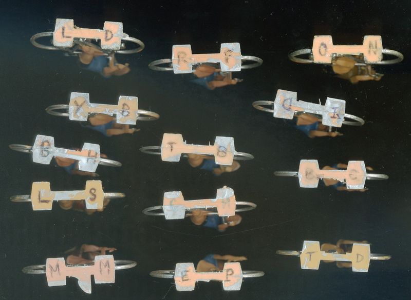 These cut-up riders, and many more (over one hundred) were purchased in Zaragoza, Spain. Each cyclist has a name written on the back and they make a peloton of ca. 1980. Someone did A LOT of work with this set.