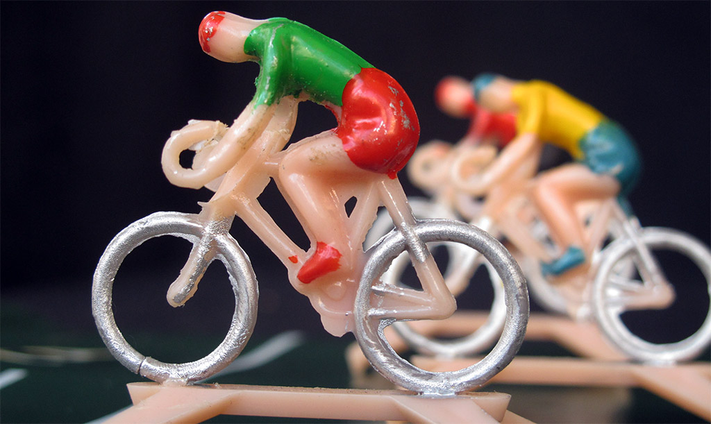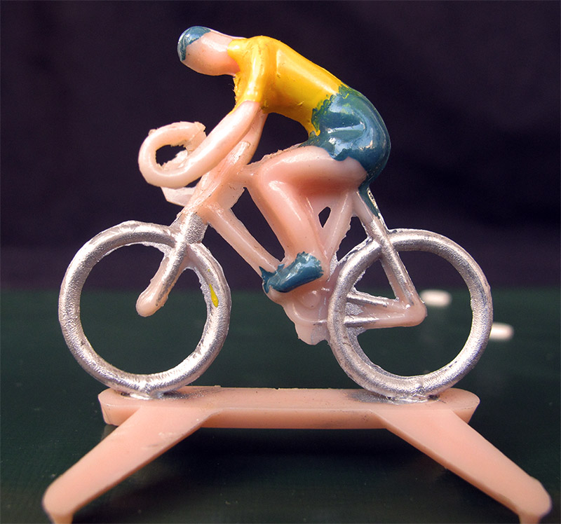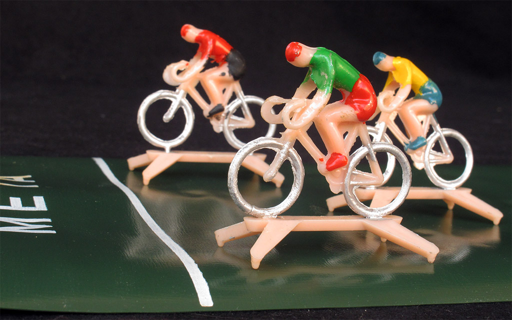 These cyclists are made of stiff plastic (probably polystyrene) and they are very stable on their four-legged wide bases.