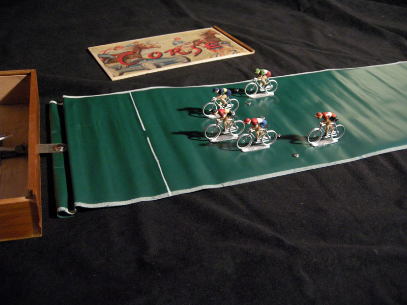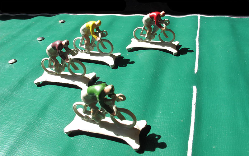 Here is the game played with modern Spanish lead cyclists. That was my first attempt to play the game when I purchased it. Unfortunately the riders were not stable enough and tended to fall.