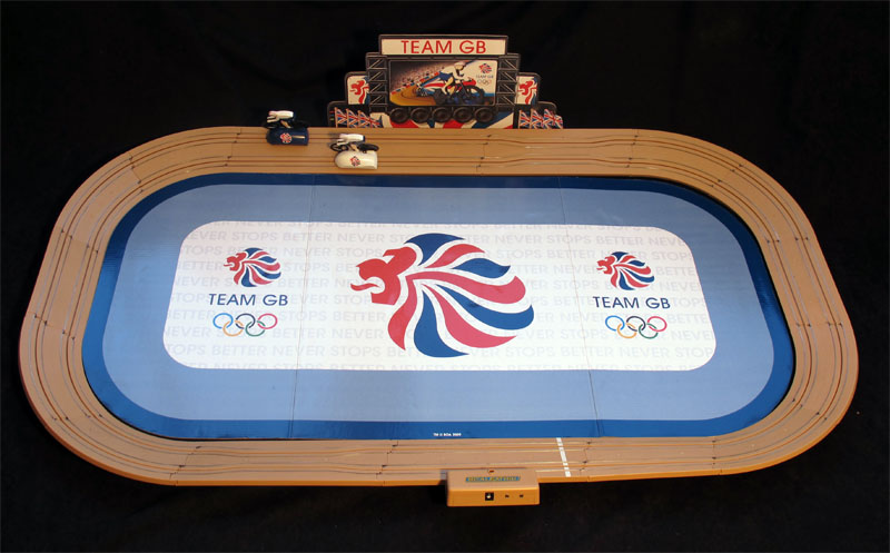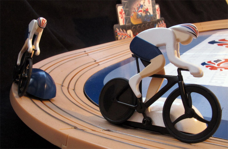 On the "pelouse" we read that the game is produced in 2009, but I have dated it in 2011, since it has not been available before. By the way, I wonder what is the name of the game. supposed to be, "Team GB"? Scalextric Velodrome Cycling Set"?