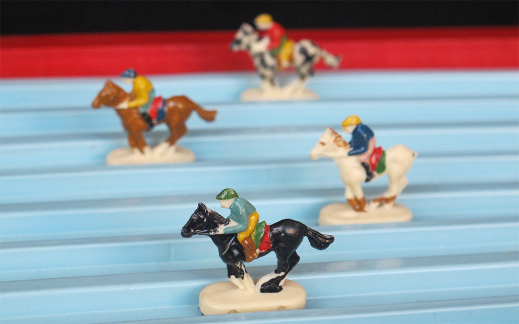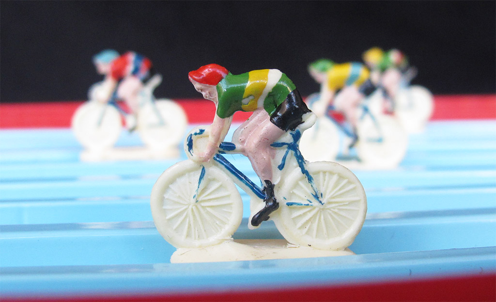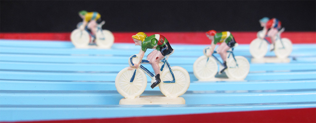 The game consists of 4 oval tracks which vibrate. The cyclists (or cars, or horses) are unevenly weighted so that they always advance, no matter in what part of the vibrating track you place them. I'm sure, the "secret" that drives the cyclists/cars/horses forward is the "fur" at the underside of their base. The vibrating track moves equally towards all possible directions. This movement causes corresponding forces onto the cyclists/cars/horses. As their friction coefficient is lower when moving forwards and higher when moving backwards (because of the fur) and as they cannot move sideways, the sum of all applied, variing forces always will move the cyclists/cars/ horses more forwards than backwards.