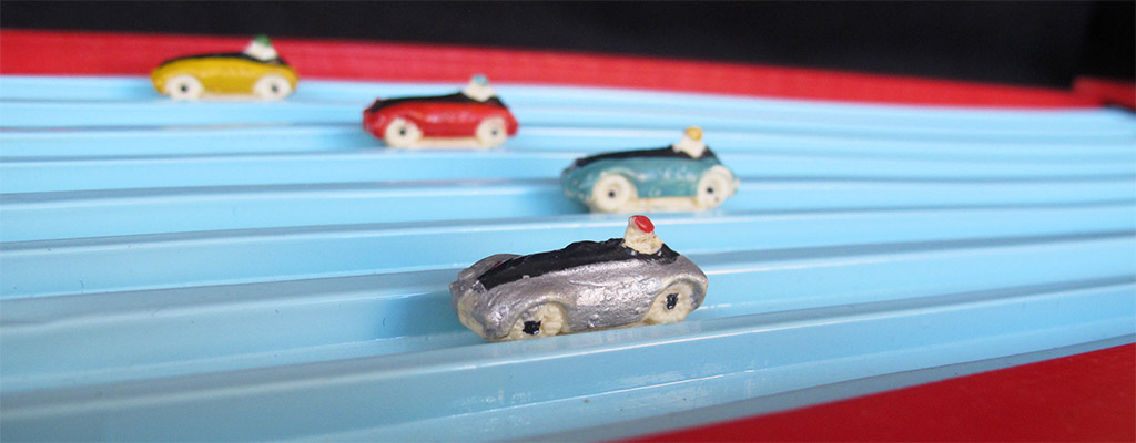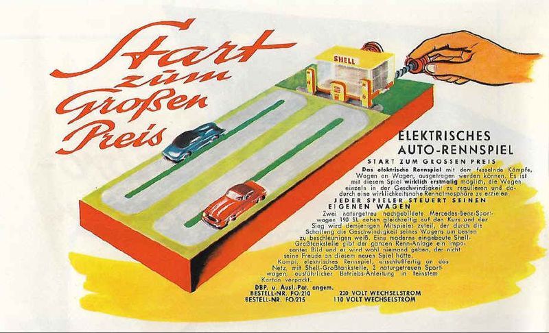 3. "Start zum Großen Preis" ("Start of the Grand Prix") is the most advanced and sophisticated version of this racing toy. This one only has two separated wider tracks, and each track has its own control! So two players can compete in a real race. This version has bigger cars, a fuel station instead of the pit lane building – and can be considered to be a racing "game of skill".