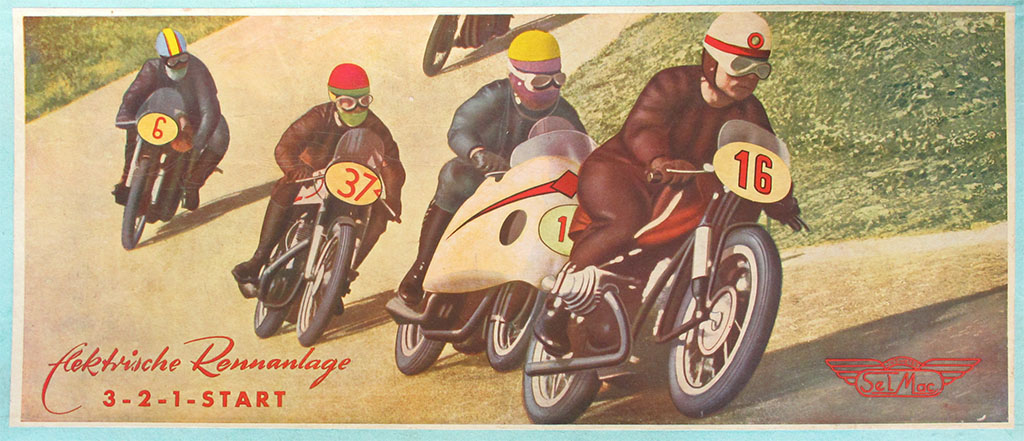 There is a chance that the game could be even older and in its first version had a different picture, which woul later have been replaced after the Solitude race in 1956 to give the box a more eye-catching look. But as long as there is no proof for this, it's remains just a possibility.Although there is no proof for a Fibro version with the coloured painting, I'd assume, there must have been such a German version too – because in the Spanish game the title is "Elektrische Rennanlage". If the coloured painting had been made exclusively for Sel-Mac, they probably would have changed the name of the game. Therefore I would assume, the game was licenced to Sel-Mac after the German version already had changed to the coloured painting (as long as we don't find a Sel-Mac version with a photograph on the box).
