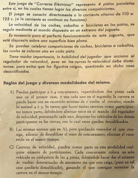 This is a mechanical game made by Sel-Mac in Barcelona. Some things about this game are obviously strange. First of all there is the title of the game in English and the subtitle "Elektrische Rennanlage" ("electric racing system") in German. One has to understand that nobody spoke English (much less German) in Spain when this game was made. We can think that the game was made to export, but the only copies I have ever seen are in Spain, so it does not look like it sold much abroad.