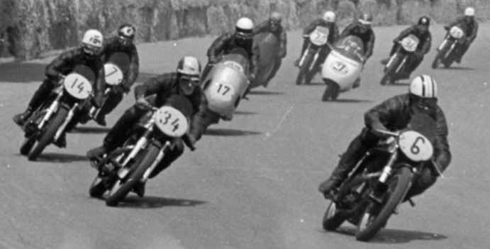 As this is a real picture, maybe one could find out by an intense research, in which race the picture had been taken. As there had been an uncountable number of motorcycle races in the 1950s and as unfortunately there isn't such a detailled documentation on motorcycle races as there is on motorcar races, I had no hope to find the race results on the www. We would have to find a 500 cc motorcycle race in which are in the starting grid: