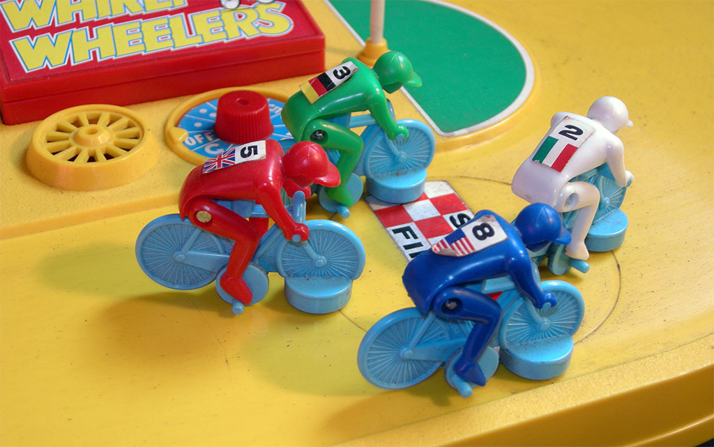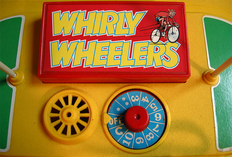 One of my favourite toys. I can spend hours watching the riders race. (I should have made a video, but you can check YouTube for some footage of this game). Cyclists are pulled by hidden motorized magnets, and the outcome of the race is supposed to be aleatory. There are two major versions of this game, this one with an oval track and another with a round track. I prefer the version with the oval track. Laps are somewhat longer there is a lever underneath the board supposed to change the level of randomness.