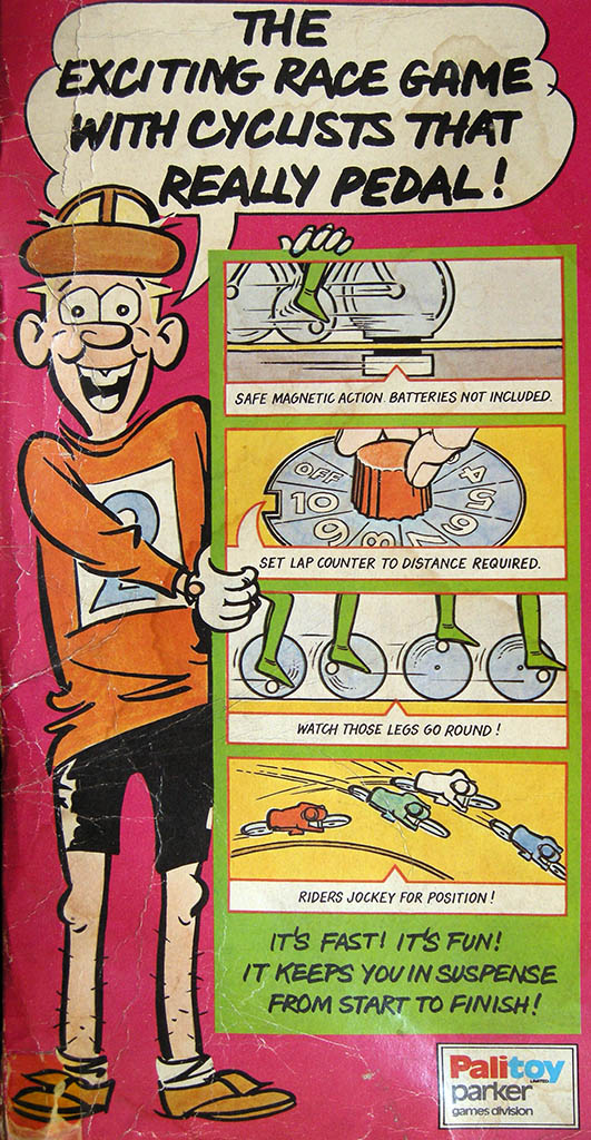 As you can see there are two versions of this game with the oval track. Both of them were manufactured in Singapore. The Whirly Wheelers version was licensed by Politoy Parker in the UK, while in other countries the game was sold as Big Bike Race.
