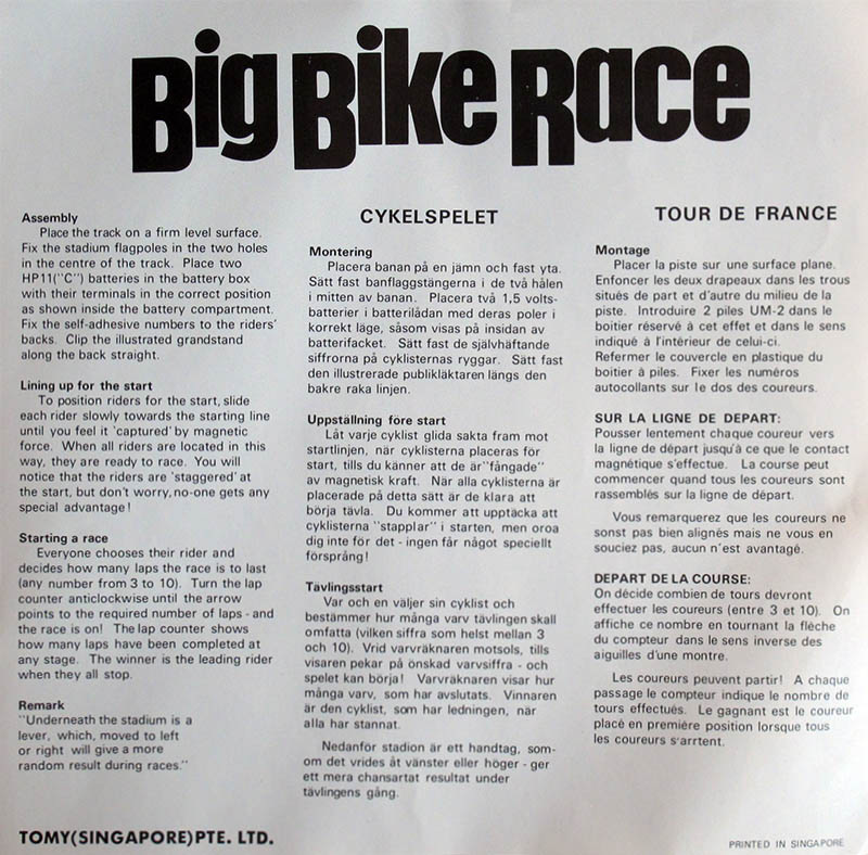Sheet inside the same Big Bike Race box. The text is in English, Swedish (instead