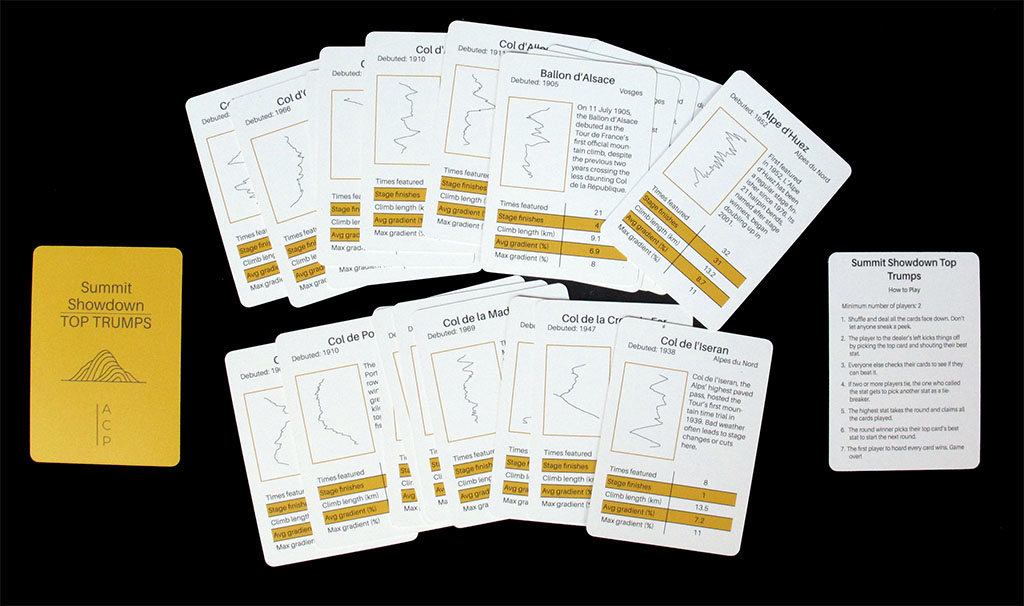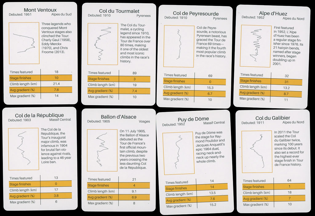 The game features 50 different cols, elegantly illustrated with a sketch of the climb. Besides the five values on the lower part of the card (number of times featured on the Tour de France, number of times it has been a stage finish, climb length, average gradient, and maximum gradient), there is a sixth value that you can use for the game: the first year the climb appeared on the Tour. Of course, in this case, the lower value (the earliest year) wins.
