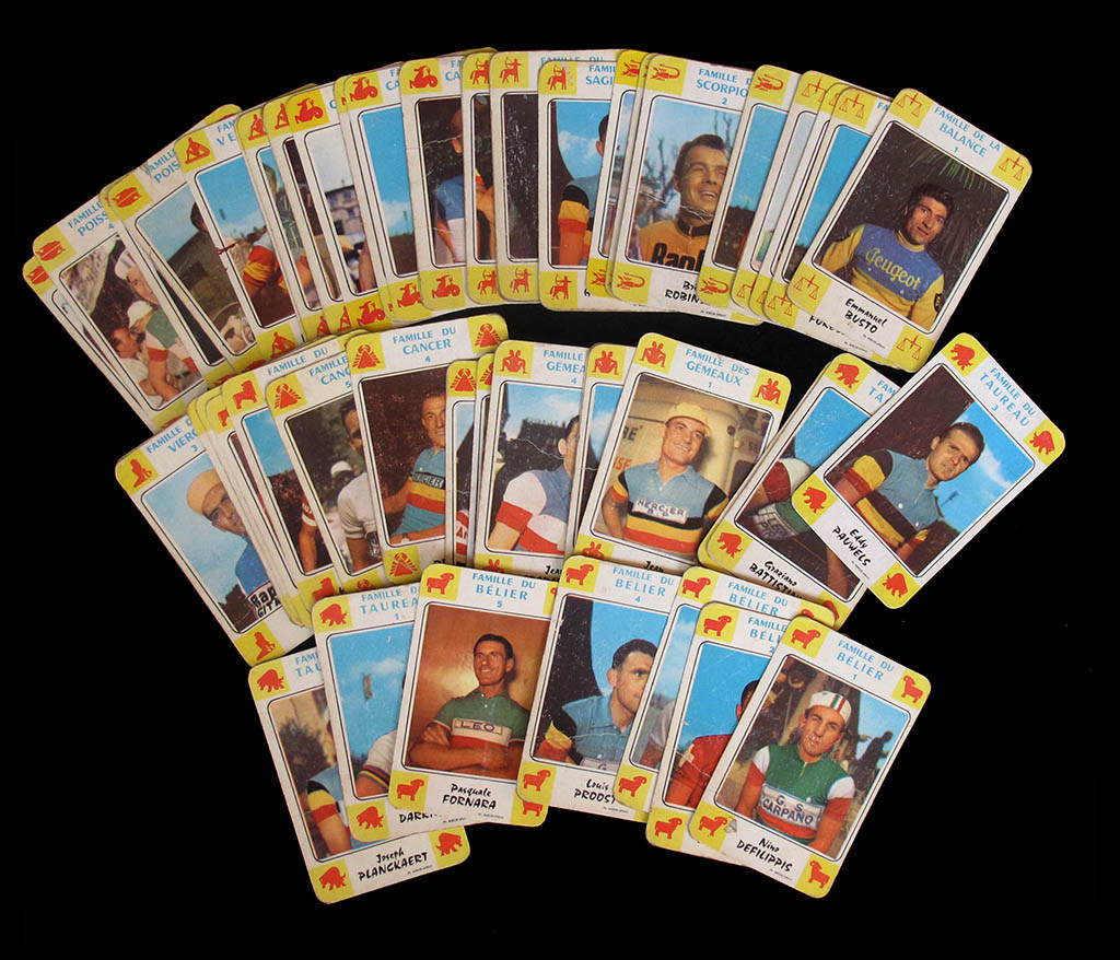It is a quite weird French "Happy Families" game that mixes cycling and astrology. As in other contemporary card games, the pictures are credited to Miroir-Sprint and, lacking other references, I have reluctantly attributed the game to Miroir-Sprint (as publisher). However, since complete sets are so rare, my guess is that these cards must have been given as a bonus with something else, whatever that may have been. Information welcome.