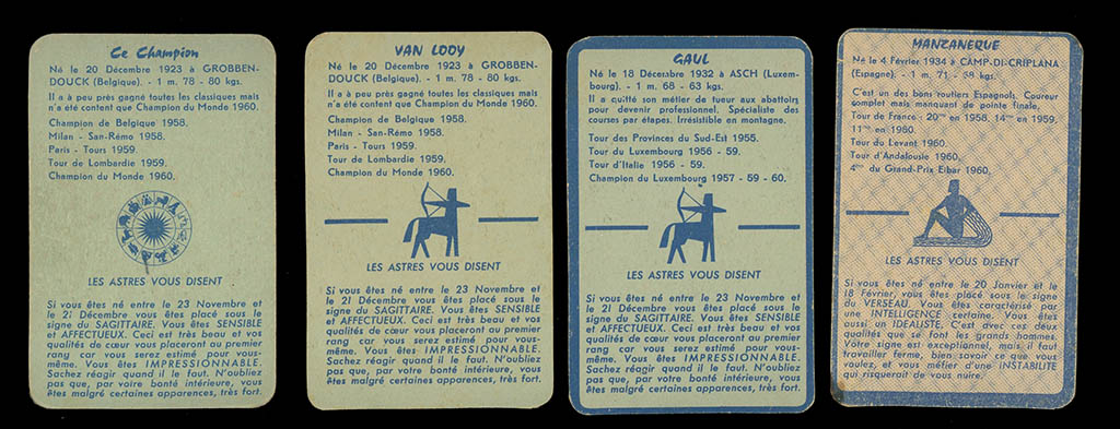 There are at least four different editions of these cards, as you can see by the different backs. The two cards on the left are both Rick Van Looy's. One of them (the one on the left, maybe the first edition) did not include the cyclist's name on the back, and did not depict a distinctive zodiac sign, as is the case with the other three backs. Even though three of the four must have been later reprints, nobody bothered to update the cyclists' results. And, of course, the astrological "information" does not change for the riders of the same sign, as you can see in the two cards of the Sagittarius family,