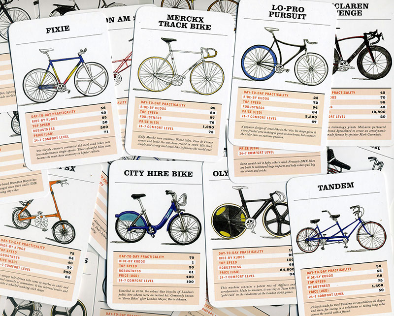 Another nicely illustrated "highest values" card game from Laurence King. This one features 30 iconic bikes.