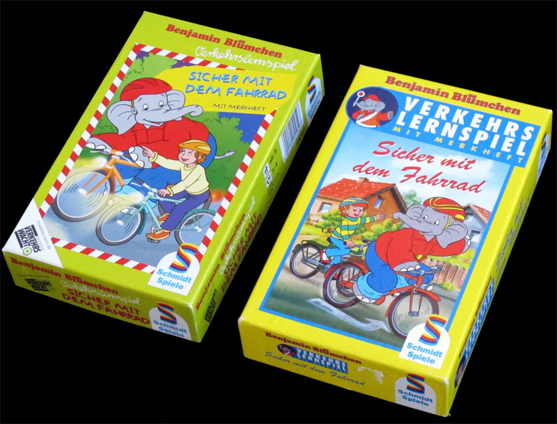 Here are a couple of simple kids' games made in Germany. They are very similar (same title, same editor, almost same rules, even same back of the cards), but I guess you can assume they are different games. Or maybe not (anyway who cares?). Of course Benjamin Blümchen is an animated children's television show very popular in Germany (though quite unknown in the rest of the world), and is used here to teach safety rules.