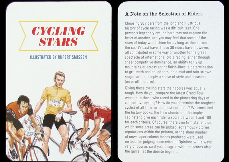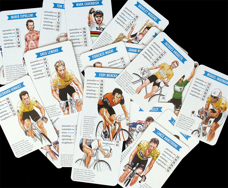 A "highest values" game from the UK. This one features 30 riders "from the long and illustrious history of cycle racing", according to the maker.