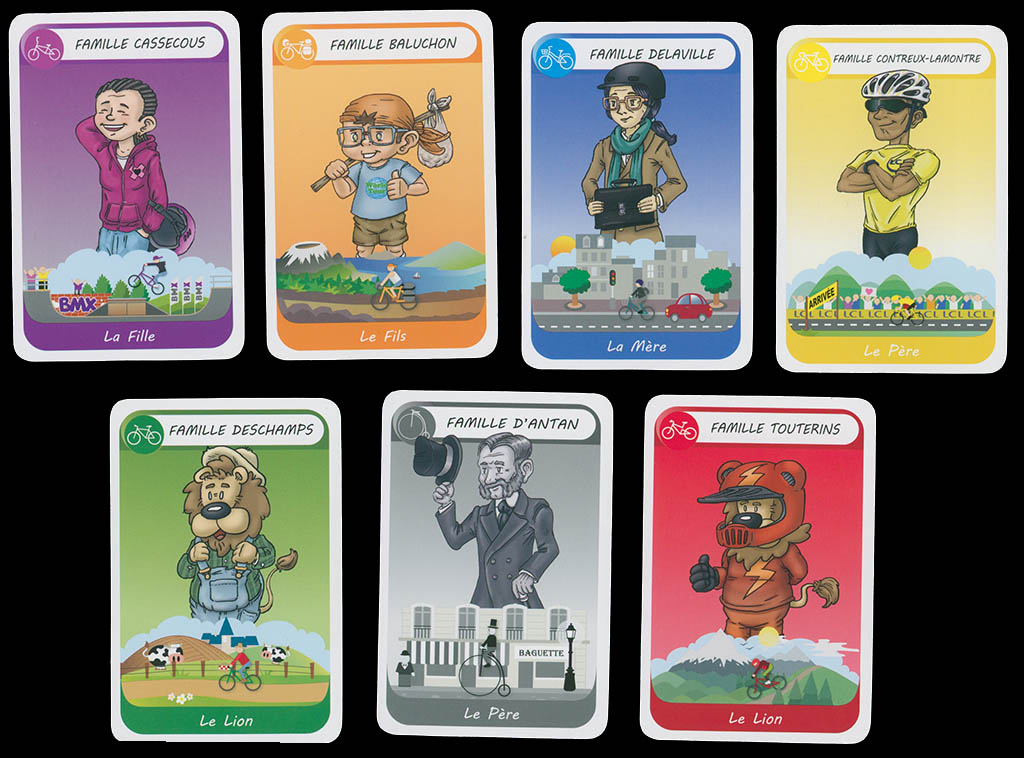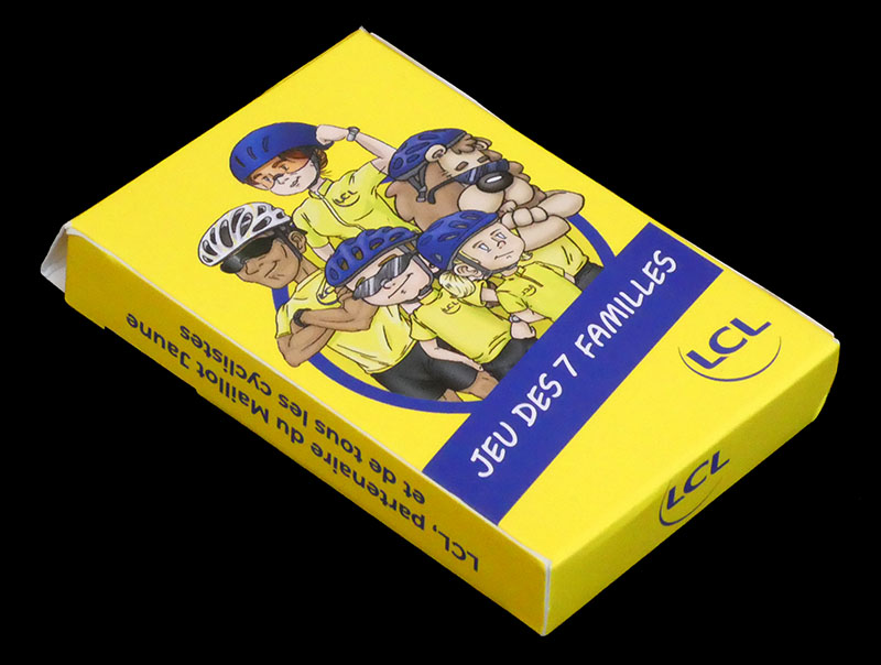 Promotional "Happy Families" card-game possibly (just a guess: if you know better, please let me know) offered at the 2024 Tour de France. The game features seven different families, with just 5 members each, which makes a rather unusual 35-card deck.
