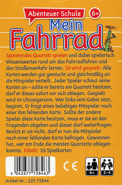 This game is part of the Abenteuer Schule (Adventure School) series, and is about "learning fun and safe behavior on the road". Each card explains an aspect of the bicycle.