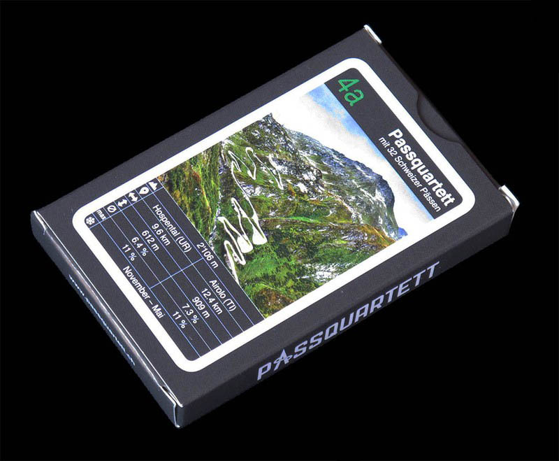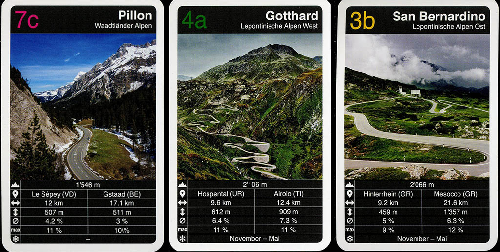 The game can be played as a quartet ("Happy Families") game or as trumps ("highest values") game. It eatures 32 cards, each one of which presents both sides of a Swiss mountain pass.To play the trumps game, players have to decide before the game starts if they are going to play with the rioght or left side of the card, so in fact you have two trumps game in one.