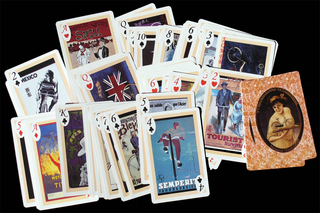 Elusive Chinese vintage cycling posters poker deck. I wonder what they mean by "one clan of romance".
