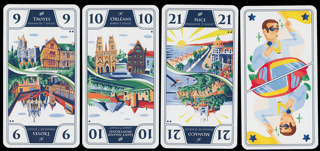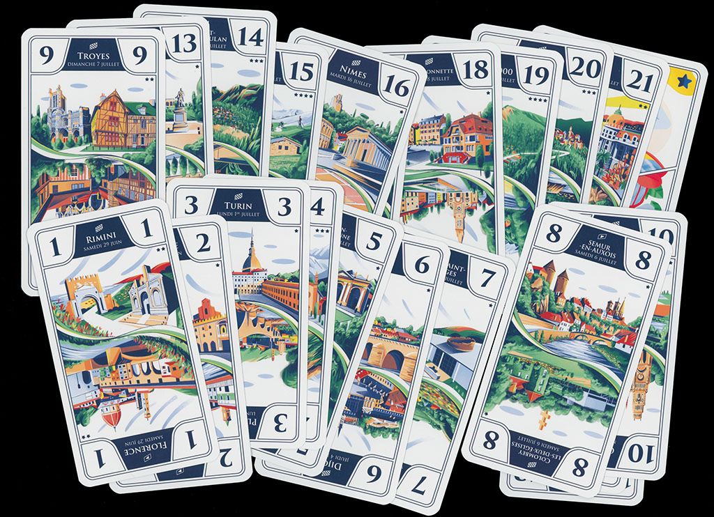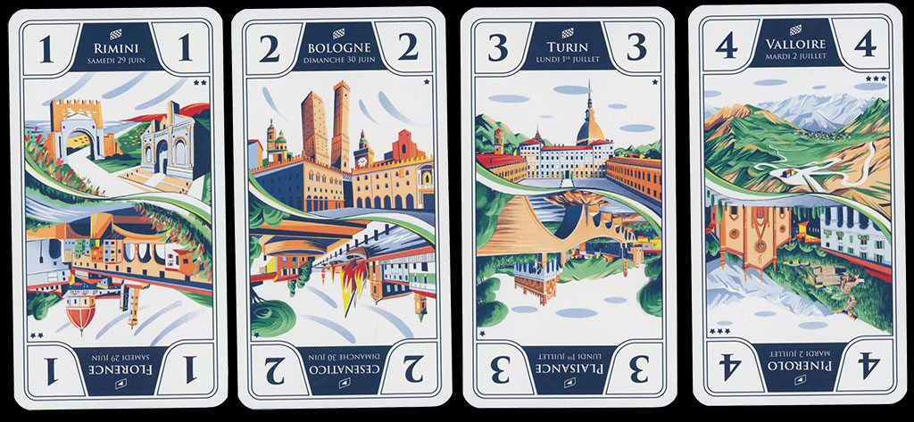 Each card features two towns, the start and finish of the stage. As you see, they are finely illustrated.