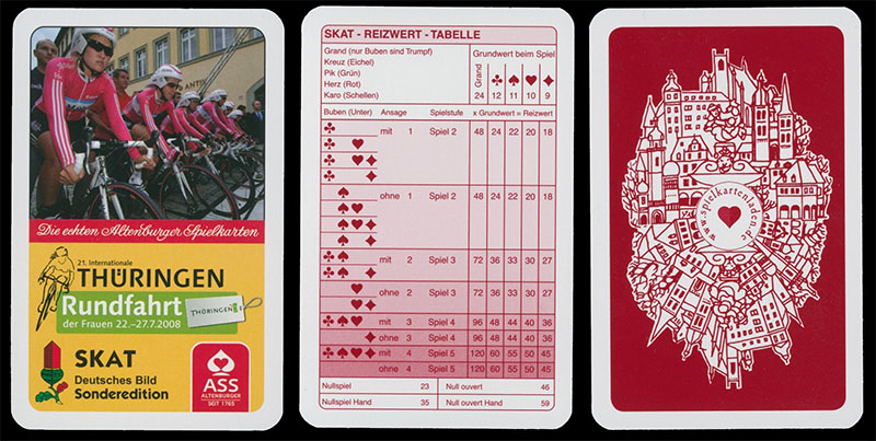 Rare promotional German skat deck, customised for the 2008 Thüringen Women's Tour. The game was produced in Altenburg by ASS. To put things in context, the Thuringen Women's Tour ace was held (under different names) from 1986 (back then Thuringia was in West Germany) almost uninterruptedly until 2024. However, the 2025 edition was cancelled after funding from the state government was withdrawn. At the moment of writing, the future of the race is not clear. On the other hand, Altenburg, in Turingia, is sometimes referred to as "playing card town". The Altenburger Spielkartenfabrik (playing card factory) was founded in 1831. ASS (which stands for "Altenburger und Stralsunder Spielkartenfabrik") is self-described as "the oldest known company in the field of playing card development and production in Europe".