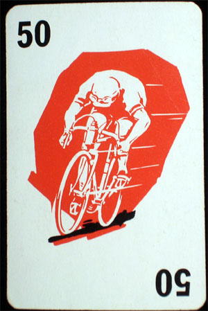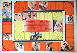 Being a particular subclass of the sports-replay-racing-games category, one expects cycling games to have some kind of distictive features that makes them different from, say, horse race or motorbike race games. R.C.Bell describes a horse racing game of mid-XIXth century, "The Game Of The Race", thus: "It sported an oval track. The riders progress was controlled by the throw of a six-sided die. Along the course were hazards."(3) Of course, some early cycling games were not more specific than this (except, of course, the counters were NOT in the form of horses). Other early games were literal adaptations of "The Game Of Goose" superimposed on a map. At least these were good for learning geography. But times have changed, and what made a nice, much sought-after, pre-WW1 game, is probably unacceptable eighty years later.