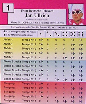 Finally, there is one feature that I personally hate in cycling games. As has been said before, some cycling games are educational: children can learn geography with them. Some games carry this even further and include some Trivial Pursuit-like question/answer cards. (The Official Tour de France 2003 game is the most recent example). I find this absolutely non-cycling. Moreover, it makes absolutely inmpossible to make a quick translation of the rules (you would have to translate all the questions). If the game is interesting enough (I am thinking of "Kelme" or "La gran Vuelta Ciclista en casa") you can always use your own alternative rule instead.