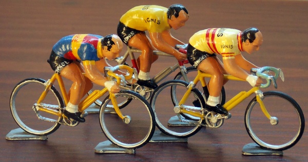 Other additions to the site include a picture of a French Roger cyclist with detachable metal bases (thanks, Marc!) for a comparison with the Spanish plastic detachable riders I posted some months ago. As well as adding games, I also continue updating (even rewriting) game reviews, often based on comments by readers. This month I feature an impressive research study by Siegfried L. on the game 3-2-1-Start.Finally, I have been contacted by two French researchers, Yvan Le Borgne and David Renault, who are trying to "explain some notions in optimisation... with a cycling game!" (their words). Well, that is interesting. They have created a little online game with simple rules to explore the behaviour of players. You may want to try the game and, in the process, provide them with some more results for their research (no personal data collected, of course). It just takes a few minutes. (To put it very quickly: all you have to do at every turn is to decide if you spend or save energy, based on incomplete knowledge of the energy you will have at your disposal in the following game turns).