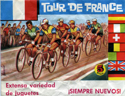 Some time ago I was able to purchase some original unopened Montaplex bags. This gives a good example of what you might find in them. Though there were both "Vuelta a España" and "Tour de France" bags, the contents were similar. Almost all the riders were yellow (a couple of bags had blue riders), all the bags had spectators (mostly green), some of the bags featured a camera or a banner (occasionally both!), and all the bags featured one or two (!) Ford-T cars with no apparent relation with cycling. Most of the paper bags were in poor condition but I have saved the best unopened ones to trade. Email me if if you are interested.