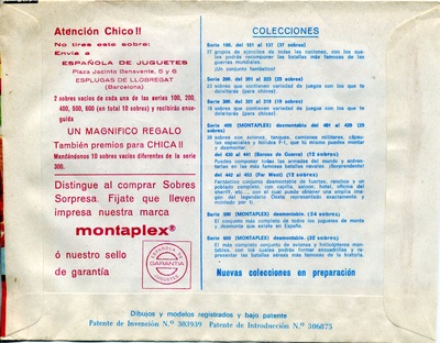 Esjusa (ESpañola de JUguetes, S.A.) began to manufacture surprise envelopes with small plastic toys within in the early 1960s. These envelopes were a huge succes and at some point Serjan, who had been distributing them, came up with the word Monta-Plex for the series and made their own company. The toys were still manufactured by Esjusa and at some point they were distributing similar envelopes with the same figurines. Both companies were from Barcelona, by the way, and let me warn you that the story might be a little different depending on where you read it. As far as I am concerned (or at least for the scope of this article) they are all "Montaplex". If someone involved with these companies wishes to make some precisions, feel free to contact me.