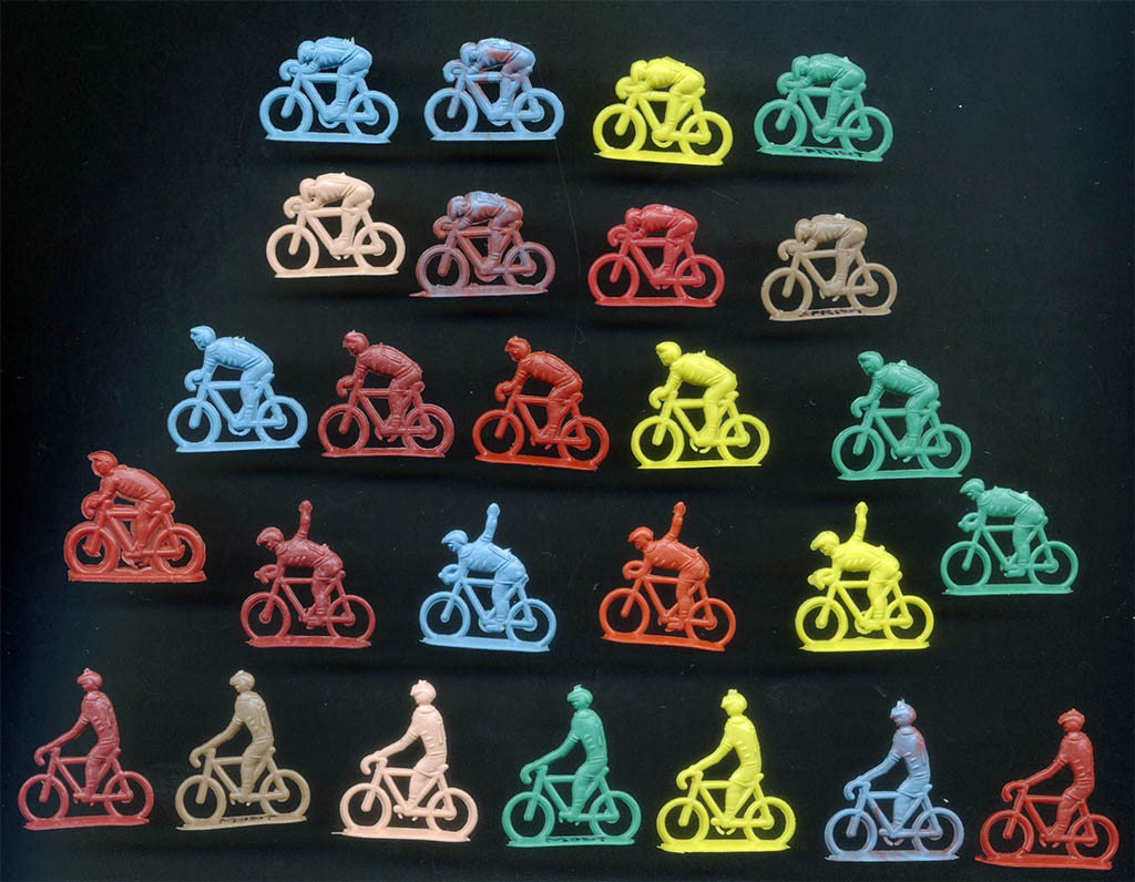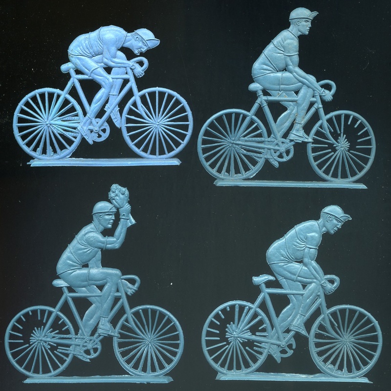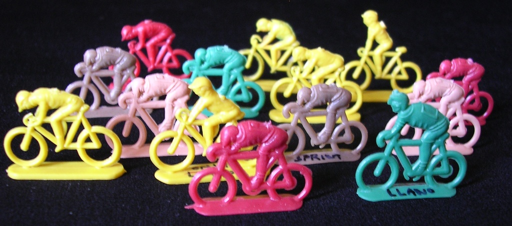 The contents of the kept changing over time. In general you could expect to find around 20 tiny low quality ciclists (roughly at scale 1/72), all the same colour, and some extras, which might be spectators, motorbikes... The figurines were uncut inside the envelopes. Although the riders were all in the same colour in the same bag, generally different bags carried different colours, so you could have a nice multicolour peloton. The quality of the contents also varied with time. In the 1/72-ish scale there were found in three series. The ones which I will qualify as "of lower quality" featured riders in 4 positions on the bike.